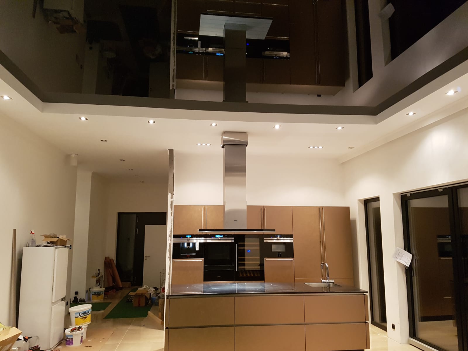 Grifflos, hell und effizient – die Küche Nordische Linie vereint skandinavische Leichtigkeit mit modernem Komfort und stilvollen Spanndecken im gesamten Wohnraum.